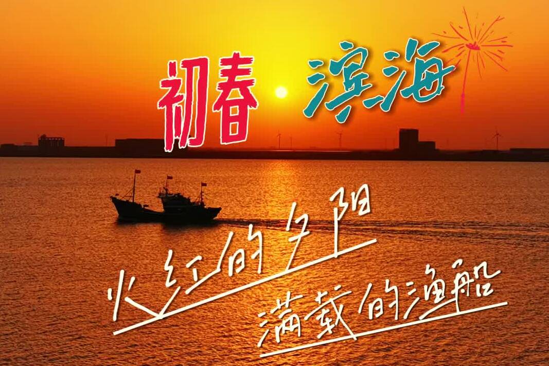 初春的濱海 火紅的夕陽(yáng)和滿(mǎn)載的漁船